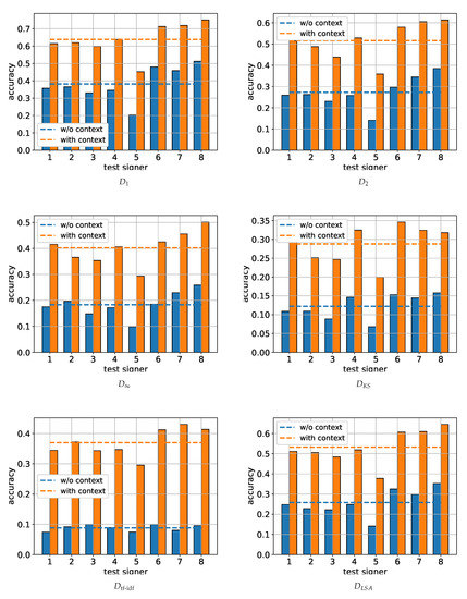In absolute terms, the combination of the metric with the incorporation of the dialogue context led to an accuracy between and (with the exception of signer five), reaching a peak performance of around . For completeness, in Figure 5 we also present the top three accuracy of the -based system (i.e., measuring the probability of the test sentence to be correctly identified to one of its three nearest neighbors in the training dataset). As is to be expected, the top-3 results significantly exceed the top-1 accuracy shown in Figure 4, reaching very satisfactory values of around and regarding the mean and peak performance, respectively.