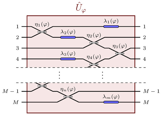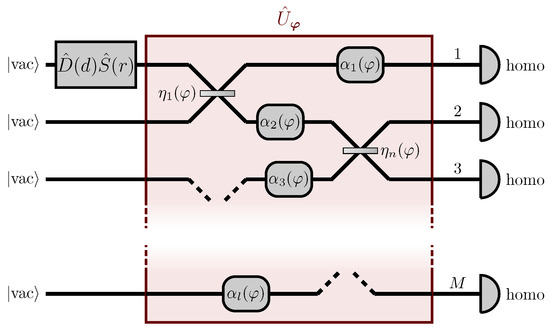 where is the probability that a single photon is transmitted through the linear network from the first to the i-th channel, and is the phase that it would acquire (In order to keep the notation lighter, we are dropping the subscript in , , and . Nonetheless, it rests assured that these quantities, in general, depend on the unknown parameter). Once again, due to the Gaussian nature of the model, the (joint) probability distribution associated with the outcome of the M homodyne detectors is also Gaussian and reads [18,19,20,21]