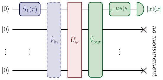 Condition (15) is the requirement that most of the photons injected into the network end up in the observed output channel. In fact, this condition can be rewritten in terms of the average number of photons that are not correctly refocused . Thus, condition (15) tells us that the number of photons which are not observed must be a constant ℓ, not growing with N. In other words, this condition assures that most of the information on encoded in the probe is not lost in channels that are not observed. As a matter of fact, we can see from Equation (6) that the variance of the observed quadrature after the interferometric evolution is the convex combination of the variances of a squeezed vacuum and the pure vacuum, with coefficients and , respectively. In order for this variance to be ‘squeezed’, in the sense that it is of order , the contribution from the pure vacuum must be of order , namely .
