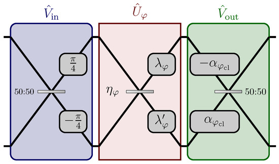 We notice from the expression of that the unknown reflectivity of the beam splitter does not influence the refocusing stage , but it appears in the phase acquired by the probe in Equation (30). In particular, if the two phases and are vanishing, the dependence of , and thus of the refocusing stage , on the classical estimation of the parameter disappears completely. In other words, this network for transforms the reflectivity of a beam splitter into the magnitude of a phase shift, independently from .