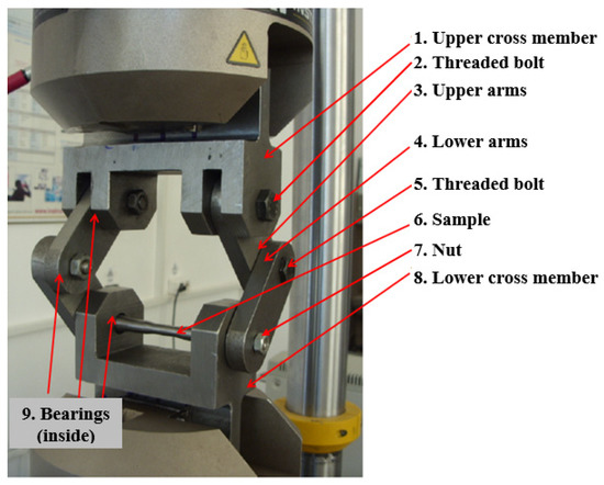 Figure 1. Thus, the simplicity of the device is combined with the facilities offered by the universal pulsating testing machine, no longer requiring special testing machines. Under these conditions, all parameters regarding the load, displacement, frequency, and number of cycles were established on the basis of the software that drives the testing machine. On the other hand, the results were stored in the files within the process computer. The device is simple and adaptable to the universal pulsating test machine, containing two mechanisms, each with two articulated arms, the two mechanisms being placed anti-symmetrically in relation to the cross section of the sample and thus being able to insert two torques equal in size and in opposite directions at the ends of the sample.