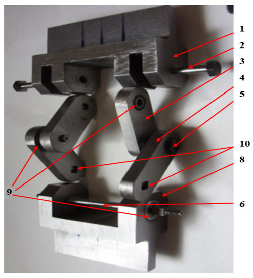 Figure 1. In the upper cross member, two arms, 3, (the upper ones) are fastened with the help of threaded bolts 2. In the upper arms, four radial bearings (not all being visible) are inserted, both at the top and at the bottom. The bearings are the radial ones, for bolts 2 and 5, which, in turn, constitute the cylindrical joints for arms 3 and 4. The arms 3 are placed anti-symmetrically, initially at an angle of 90° relative to each other. The lower arms 4 are articulated by the arms 3 by means of the threaded bolt 5. At the bottom part, the arms 4 have a clearance, 10, square in shape. This is provided for gripping the sample 6 which has the ends with the transversal section, also with square form,