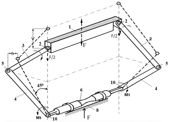 The distance between the two joints, measured perpendicular to the axis of the specimen, for the constructed device, is 88 mm. Under these conditions, during the vertical pulsating movement of the piston of the test machine, the two pairs of arms will perform opposite rotational movements, which allow the introduction at the ends of the specimen of equal and opposite torques. Thus, the requirement of a pure torsion test is satisfied. In order to determine the shear stress in the specimen, the torque moment Mt applied to the ends of the specimen must be evaluated as a function of the force F and the movement v recorded on the test machine. To determine a calculation formula in this regard, we represented the forces resulting in the joints of the device when the testing was carried out. Thus, in
