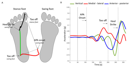 APAs have been extensively studied in persons with Parkinson’s disease (PD), because of their balance deficits, gait impairments and frequent falls [4]. PD is characterized by motor signs resulting from a degenerative loss of dopaminergic neurons in the substantia nigra as well as in multiple motor and non-motor regions of basal ganglia [5]. The basal ganglia are understood to be essential in planning and initiating movement, and APAs are consequently abnormal in PD [2,6]. Several studies have shown that subjects with PD have a reduced magnitude of muscle activity and abnormal muscles co-contractions during the postural adjustments with subsequent alteration in postural balance [2,7,8]. This results in prolonged timing of the GI, decreased propulsive forces and reduced COP displacements, compromising the shift of the body mass over the stance limb. Impaired APAs are associated with gait start hesitation or gait freezing that leads to falls, injuries, and fear of falling with a substantial worsening of several activities of daily living [9]. For this reason, the identification of a behavioral measurement that can describe balance disturbances in PD is highly needed, especially in a home-based unconfined context. This would allow monitoring the occurrences of dangerous situations and defining a personalized training program to improve APAs. This last aspect is particularly important in light of the results of a recent study that found a preserved flexibility of dynamic postural control in individuals with PD [10]. Indeed, home-based training, applying IMU-based systems, has been recently developed to improve gait performance, gait-related activity and health-related quality of life in people with PD, and results are encouraging [11,12,13]. However, in these studies, gait training was focused on the execution phase only, without considering the planning phase and postural adjustment of the APA, which are fundamental for a correct gait execution. Moreover, it is worth considering that recently, IMUs have been used for evaluating GI and the APA with a fair success [14,15]. Nevertheless, for the automatic detection of the APA onset, the toe-off and the heel-strike, the proposed protocols require either a minimum of three IMUs [16] (placed on the trunk and on the shanks) or the integration of data coming from footswitches [17] or pressure insoles [18]. The need for multiple sensors located on the body restricts the usability of these protocols in patients with neurological disease [19] both in home-based and clinical settings [20,21,22,23,24]. Furthermore, these approaches are limited because they require the subject to stand in a pre-specified manner, and often require a relatively extensive calibration phase.