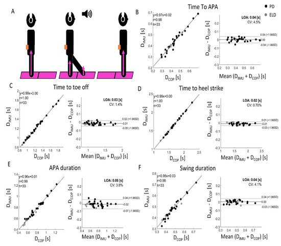 A schematic representation of the experimental paradigm, where the subjects stood on the first platform and took a step forward on the second platform when the stimulus arrived in the headphone (A). Bland–Altman plots of APA measures are reported from (B–F). PD persons with Parkinson’s disease; ELD elderly.