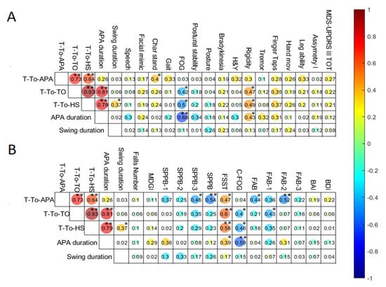 Correlations between gait initiation metrics and clinical outcomes for MDS-UPDRS III and its sub-items (A) and the other clinical scales (B). Absolute values are reported in the boxes, whereas the circle color indicates the positive (red) or negative (blue) degree. Significant correlation indices are indicated with * p < 0.05 and ** p < 0.01. H&Y stage, Hoehn and Yahr stage; MDS-UPDRS III, Unified Parkinson Disease Rating Scale Part III; MDGI, modified Dynamic Gait Index; SPPB short physical performance battery; FSST Four Step Square Test; C-FOG, Characterizing Freezing of Gait; FAB Frontal Assessment Battery; BAI, Beck Anxiety Inventory; BDI-II Beck Depression Inventory.