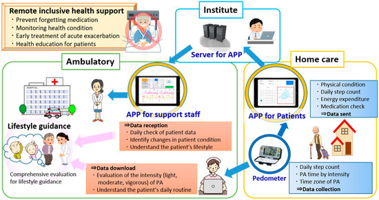 For these reasons, we developed a remote health monitoring and support system that uses information and communication technology (ICT), with the aim of assessment and management of the physical condition and PA levels of home-care patients with COPD.