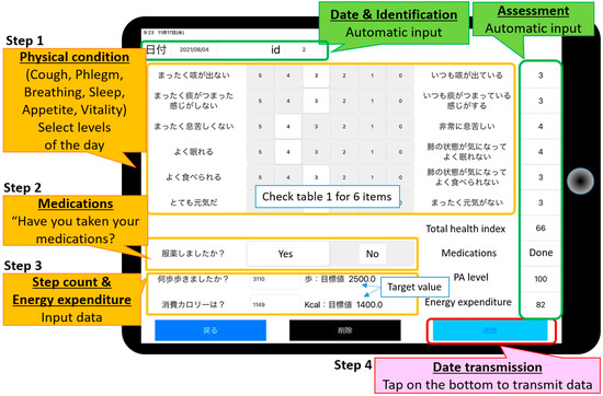 Figure 2. Data input and send screen of the tablet (APP for patients). The data inputted include (1) body condition; (2) medication check; (3) number of steps/day and daily energy expenditure. When the patient taps the “send” button, all data for that day are transmitted to our server.