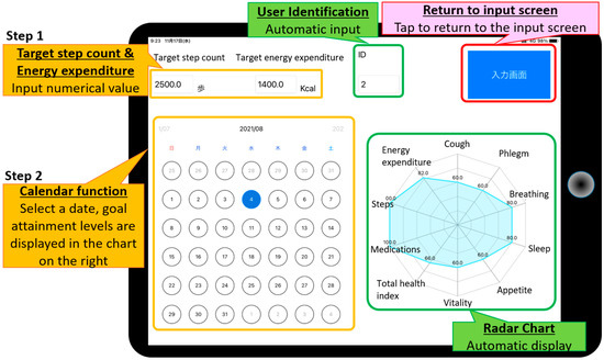 We developed a remote system for monitoring the health condition and providing home health care support for elderly patients with COPD. The aim was to improve their PA habits and to prevent their condition from worsening, which can lead to other health problems, such as frailty and depression [11]. The system is outlined in Figure 1. We decided to utilize a tablet computer as the system device and, accordingly developed an application to handle input and transfer of the following data: six assessment items regarding extent of symptoms (cough, phlegm, breathing, sleep, appetite, vitality), daily step count, and energy expenditure. The six symptom assessment items were developed by a doctor and nurses involved in the treatment of home-care patients with COPD (Table 1). In the self-assessment, the application shows the patient’s own data as a radar-chart or a time-series graph on the screen, and data for the six items are displayed on the screen along with the extent of symptoms. The results of an overall evaluation of the six items are presented as the ‘Total Health Index’, which is unique to this application, and was calculated using an original formula. The ratings for each of the six assessment items (from 0 to 5) were added and multiplied by 20, and then divided by the number of items, i.e., six, to obtain the value of the Total Health Index (Equation (1)). As the target users of the system were elderly patients with COPD, we designed the operation method to be as easy as possible, with a minimal amount of information displayed.