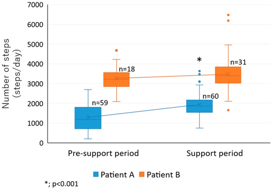 In patient A, the average number of steps per day and duration of PA per day were significantly higher during the support period than the pre-support period (1954 steps (591) vs. 1243 steps (680); 24.2 min (7.4) vs. 15.2 min (8.9), respectively; both p < 0.001) (Table 4, Figure 6). In patient B, although the average number of steps per day and total duration of PA per day improved after using the system, the increase was not significant (3253 steps (640) vs. 3474 steps (1003) steps; 39.7 min (8.1) vs. 42.9 min (12.9)).