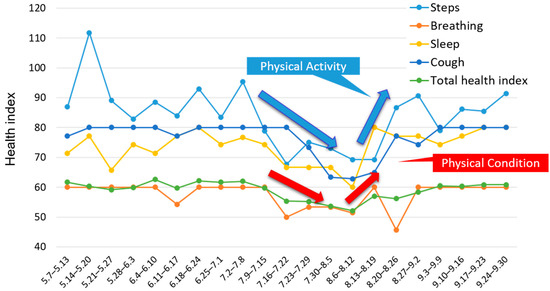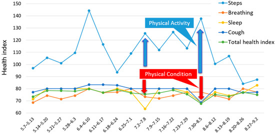 Figure 7 shows changes in the levels of selected health indices per week in patient A from May to August 2021. The graph shows that patient A performed less PA when symptoms such as coughing and breathlessness were severe, and when he had insufficient sleep. PA improved along with improvements in his physical condition. In the hospital interviews with patient A, he said that he tried to limit his activity when he was not feeling well; therefore, we considered that he had appropriate self-management ability in relation to coexistence with COPD. In addition, collection of patient A’s previous PA data that had been measured over the course of his treatment for two years showed that the number of steps tended to decrease in the coldest part of winter and in the hottest part of summer. This kind of seasonal data will enable doctors and other support staff to consider personalized support methods, in anticipation of worsening COPD symptoms at these times.