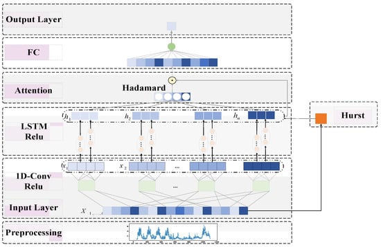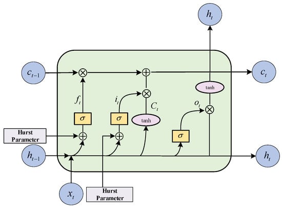 - The model incorporates the self-similarity property of network traffic as a priori knowledge into the intermediate structure of the deep network; namely, the Hurst exponent is added into the gating of the long short-term memory neural network (LSTM) as a bias term to increase the model’s interpretability.