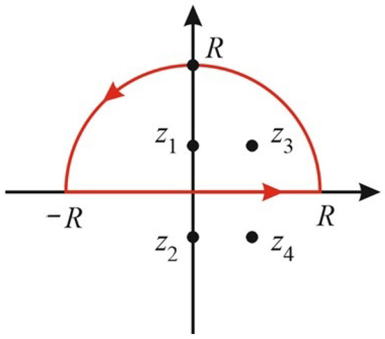 Let us choose the closed curve consisting of section and semicircle in half-plane where the imaginary part is positive—as shown in Figure 3. According to residue theorem, the integral of the function under consideration over the closed curve is equal to and summation is taken over all the singularity points inside the curve—i.e., over and . In the limit , the integral over the semicircle tends to zero (since the semicircle length is proportional only to R and the integer and falls as ). Obviously, the integral over the section tends to the required value I. Let us calculate the residues at points and :