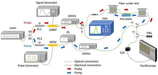 The experimental setup for BOTDA is illustrated by Figure 5. A continuous-wave (CW) laser source having a linewidth of 100 kHz was used as an input signal with a centre wavelength at 1552.92 nm. The source radiation was split by a 50:50 optical coupler into a CW probe and pulsed pump signal. The probe arm is comprised of three main components: a signal generator, a single side-band modulator and an erbium-doped fibre amplifier. The CW light was modulated with a high-frequency radio signal by the SSBM which generates a carrier suppressed double-sideband probe signal. The radio frequency was swept at 1 MHz scanning step between 10.765 to 10.935 GHz, which is the typical range of BGS for a single-mode fibre. The modulated signal was amplified to 0 dBm by EDFA1 and then sent into the fibre under test (FUT). The FUT was subjected to five different temperature levels, 45 °C to 85 °C with 10 °C increment.