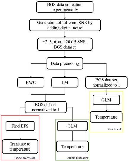 Once the data of five different temperature conditions have been collected experimentally, the BGS is distorted by digital noise as described in the previous section. There are four different values of SNR that had been generated through digital noise: −2, 3, 6 and 20 dB, comprising four datasets with five different temperature conditions in each of the datasets. The complete steps of the whole data processing areas are visualised in Figure 6. Once the added digital noise dataset is generated, the following step is processing the spectra with the LCF- and correlation-based methods: LM and BWC. The purpose of this step is to improve the noisy spectra by replacing them with a smooth Lorentzian curve. Next, the new spectra are normalized to unity for better efficiency when using the machine learning method in the later stage.