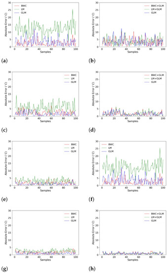 The absolute error results obtained after data processing: (a) −2 dB single processing; (b) −2 dB double processing (c) 3 dB single processing; (d) 3 dB double processing; (e) 6 dB single processing (f); 6 dB double processing; (g) 20 dB single processing; (h) 20 dB double processing.