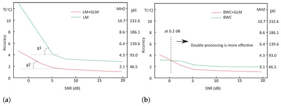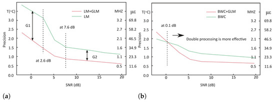 For measurement precision test at a −2 dB SNR, it has been improved by 1.6 °C (1.71 MHz or 37.2 ) in LM when using the double processing technique. This was followed by 1.7 °C, 0.7 °C and 0.5 °C improvement respectively for 3, 6 and 20 dB SNRs. It should be noted that there are two areas of the SNR-axis at Figure 8a showing stable differences of precisions between single and double processing—for SNRs below 2.6 dB, it is about 1.5 °C (1.6 MHz or 35 )—labelled as G1, and for SNRs above 7.6 dB, this value equals to 0.5 °C (500 kHz or 11.6 )—labelled as G2. This means that for SHM data with extremely low SNR, adding GLM after LM in the processing stage is necessary to keep the precision within acceptable level.