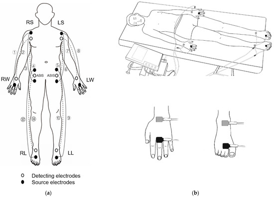 Quantum Desktop RJL-101 (RJL Systems, Clinton Twp, MI, USA), a 4-point electrode (tetrapolar) real-time BIA device, was used as the criterion measure to assess the accuracy of the estimated segmental impedance parameters from the OS-BIA. Participants were instructed to refrain from strenuous exercise, alcohol, and caffeine intake for the 24 h before the experiment, finish their last meal at least 4 h before the measurement, and empty their bladder within 30 min before the measurement. Participants adopted a supine position with limbs slightly spread apart from the body (Figure 1a). Adhesive gel electrodes were placed at defined anatomical sites on the anterior surface of the trunk and the dorsal surfaces of the hands, wrists, ankles, and feet on the right and left side as explained in the following. The measurements of the right and left arm were taken by attaching one pair of electrodes on the hand and wrist and the other pair of electrodes on the anterior surface of the shoulder. For the shoulder, the superior edge of the current electrode was attached on the inferior border of two-thirds of the clavicle and the voltage electrode 5 cm inferior to this point. For the hand and wrist, the proximal edge of the detecting (voltage) electrode was attached to form an imaginary line bisecting the styloid process of the ulna and the proximal edge of the source (current) electrode on an imaginary line bisecting the metacarpophalangeal joint of the middle finger [36,37]. Trunk impedance was measured by placing one pair of electrodes on the anterior surface of the shoulder and the other pair of electrodes on the surface of the lingual crest on the anterior midline of the proximal thigh on the right and left sides. For the right and left shoulders, the superior edge of the source electrode on each side was attached over the inferior border of lateral two-thirds of the clavicle and the detecting electrode 5 cm inferior to this point. For the lingual crest, the detecting electrode was attached to the anterior superior iliac spine and the detecting electrode 5 cm superior to the source electrode [36,37]. Leg impedance of each side was measured by placing one pair of electrodes on the foot and ankle and placing the other pair of electrodes on the surface of the lingual crest on the anterior midline of the proximal thigh. For the iliac crest of each side, the detecting electrode was attached to the ASIS (anterior superior iliac spine), and for the iliac crest of each side, the detecting electrode was attached to the ASIS and the source electrode 5 cm superior to the detecting electrode. For the ankle and foot of each side, the proximal edge of the ankle detecting electrode was attached to form an imaginary line bisecting the medial malleolus, and the distal edge of the foot source electrode was placed to form an imaginary line through the metatarsophalangeal joints of the second and third toes [36,37].