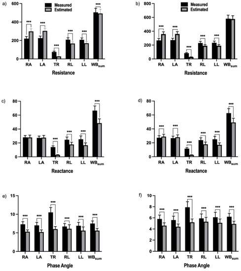 Comparison of the estimated impedance parameters to the measured impedance parameters with respect to resistance (R), mean reactance (Xc), and mean phase angle (PhA) measured at 50 kHz frequency. (a,c,e) correspond to R, Xc, and PhA values in males; (b,d,f) correspond to R, Xc, and PhA values in females. WBsum: Whole body as the sum of the segments for right arm, trunk, and right leg. *** = difference between the estimated and measured values at p < 0.001.