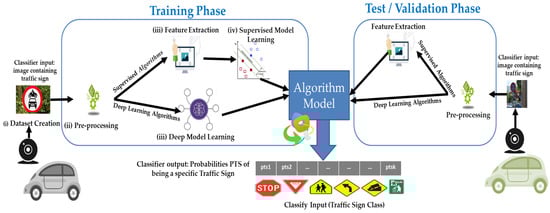 Available TSD systems can precisely extract areas of an image or a frame, which are supposed to contain a traffic sign. Thereto, TSR systems that embed Machine Learning (ML) algorithms [13,14,15,16], process features that are extracted from those images through feature descriptors (e.g., Histogram of Oriented Gradients (HOG) [17], Local Binary Pattern (LBP) [16] to recognize traffic sign categories [18,19]. Alternatively, deep learning algorithms, such as AlexNet, googLeNet [20] can directly process images coming from sensors and classify them according to internal representation learning processes, which are orchestrated through multiple convolutional and fully connected layers. Throughout the years, many studies tackled TSR [21,22,23] using different feature descriptors and ML-based classifiers. Different combinations of such classifiers and features have been proven to generate heterogeneous classification scores [15,19,24,25,26,27] motivating the need for comparisons to discover the optimal classifier for a given TSR problem [3,28,29].