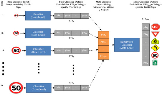 The paradigm of meta-learning can be adapted to TSR as shown in Figure 3. Let k be the number of different categories of traffic signs (i.e., classes), and let s be the size of the sliding window. Starting from the left of the figure, frames are processed by means of single-frame base-level classifiers, which provide k probabilities PTSi = {ptsi1, … ptsik} to classify each frame. Depending on the current time tj, we create a sliding window of at most s×k items, namely swsj = {PTSj, PTSj-1, … PTSj-s-1}, which builds the meta-data to be provided to the meta-level classifier. On the right side of Figure 3, the meta-level classifier processes such meta-data and provides the k probabilities PTSfinal, which will constitute the classification result of the whole sequence within the sliding window. As time moves on, we will have newly captured images and the sliding window will process the most recent s × k items. Note, that the sliding window swsj may contain less than s × k items when j < s (e.g., the window of size 3 at time t2 in Figure 2). In those cases, the TSR system will decide based on a single-frame classification of the most recent image.