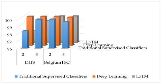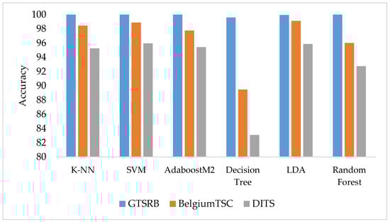 Only a few comparative studies have been proposed in the literature. For example, Jo [15] trained different supervised classifiers on HOG features extracted from the GTSRB dataset. Similarly, Schuszter [70] reported on experiments with the BelgiumTSC dataset [32], where HOG features were extracted from images and then fed to the SVM to classify one of the six basic traffic sign subclasses. Yang et al. [19] provide a comparison of different classifiers, such as the K-NN, SVM, Random Forest and AdaBoost trained by using combinations of features. This study reported the highest accuracy by using Random Forest with the combination of LBP and HOG features. Another study [29] compared traditional supervised classifiers and deep learning models on three datasets, i.e., GTSRB, BelgiumTSC and DITS considering three broad categories of traffic signs, i.e., red circular, blue circular and red triangular. Noticeably, both traditional supervised classifiers and deep classifiers achieved perfect accuracy on GTSRB. Moreover, the authors of [18] trained different classifiers for traffic sign recognition. They considered the GTSRB dataset and extracted HOG features to train LDA and Random Forest. Additionally, they used the committee of Convolutional Neural Networks (CNN) and multiscale-scale CNN. While in the study [31] authors organized a competition to classify GTSRB dataset traffic signs. These traffic signs were categorized by human and ML algorithms and an accuracy of 98.98% was achieved which is comparable to human performance on this dataset.