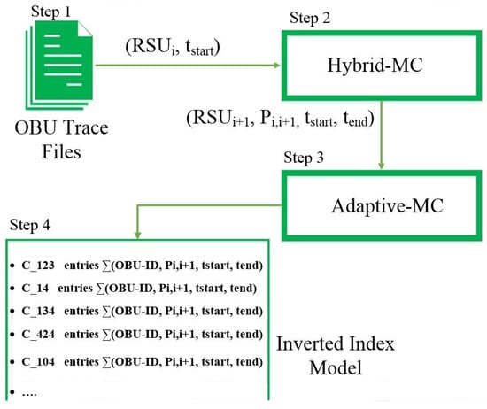 - As soon as the predicted trajectory among two RSUs is identified, the inverted index should be updated. To do so, first, each row in the inverted index model is indexed by each grid cell ID of the predicted trajectory. Then, the tuple ( , , , ) is stored in the corresponding row of the inverted index model. Expired tuples for each vehicle are deleted from the rows. Finally, by summing up the number of tuples stored at each row, we can estimate the number of vehicles that may pass through the respective grid cell from to .The output of the proposed trajectory density predictor is stored in = {(, P-), (, P-),…, (, P-)}. The set includes two item tuples, where the ∈ {, , …, } demonstrate grid cells on the predicted trajectory that is passing from to , and P- store the OBU IDs that we estimated to meet each other on the specific grid cell of the predicted trajectory.