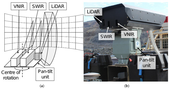 The apparatus to collect data for the study comprised VNIR and SWIR hyperspectral cameras and a three-dimensional light detection and ranging (LiDAR) sensor mounted on a pan-tilt head. Real-time kinematic global navigation satellite system (RTK GNSS) receivers and joint encoders from the pan-tilt head provided information to determine the six-degree-of-freedom (DOF) pose of the camera–LiDAR assembly. The apparatus was mounted to a utility vehicle, allowing transportation around the mine site and a platform from which to perform surveys (see Figure 1).