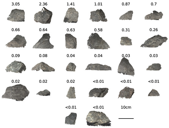 Fieldwork was undertaken in May 2019 at a gold mine in the Goldfields–Esperance region of Western Australia. Prior to this field work, the mine provided various ore samples, intending to cover a range of ore grades (see Figure 2). These were scanned in a laboratory under broad-spectrum halogen illumination. Scans were obtained at a sample distance of 1 m, using the same system as the field scans except for shorter focal-length lenses. These samples were sent to a laboratory for fire assay to determine gold concentration. The hyperspectral scans of these samples, and the associated concentration data, form the spectral libraries and training sets used for classification, as described in Section 2.4.
