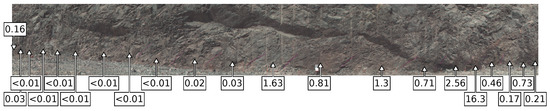 False, three-colour image of the scanned site, with approximate sample locations and gold concentration (ppm) obtained from fire assay. Gold content data provided by AngloGoldAshanti. The red, green, and blue channels display the 1000 nm, 550 nm, and 464 nm bands from the data cube, respectively. The 1000 nm channel from the short-wavelength infrared (SWIR) camera was selected to create an image that fuses information from both cameras.