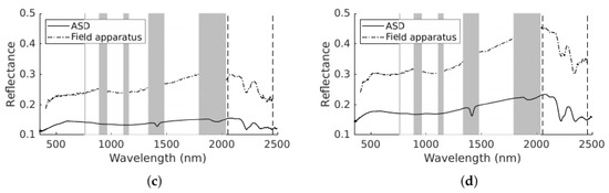 Sample spectra scanned with the Analytical Spectral Devices, Inc. (ASD) TerraSpec FR and the spectral pixel from the scene scanned by the field apparatus corresponding to the approximate location from which the sample was taken. The grey bands represent regions where there is significant atmospheric absorption and data have been removed. The dashed lines at 2050 and 2460 nm show the bounds of the spectral region that was used for classification. (a) <0.01 ppm. (b) 0.17 ppm. (c) 0.71 ppm. (d) 1.63 ppm.