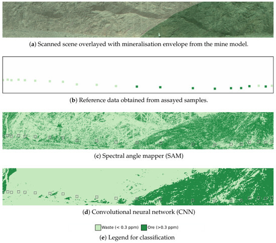 Job et al. [41] presented a desktop study of a shovel-mounted hyperspectral imaging system for coal or ore sensing. The intent was to leverage the motion of the machine to conduct a spectral survey of the working face during operation. Herein, we take the first steps towards proving this capability in a field deployment within a production gold mine. We evaluate the application of a convolution neural network, trained on samples obtained from the mine, to discriminate ore and waste at the point of excavation. The performance of the neural network is compared with results from the spectral angle mapper as a competing approach and with the mine site geological model. The results suggest that ore grade discrimination is possible and an instrument mounted on the excavator could provide real-time information on ore–waste boundaries at the point of excavation. This information could be provided to the excavator operator, or the planning algorithms of an automation system, to reduce dilution and increase ore recovery.