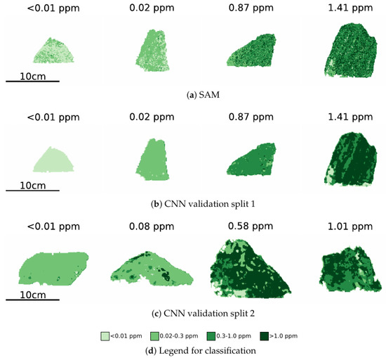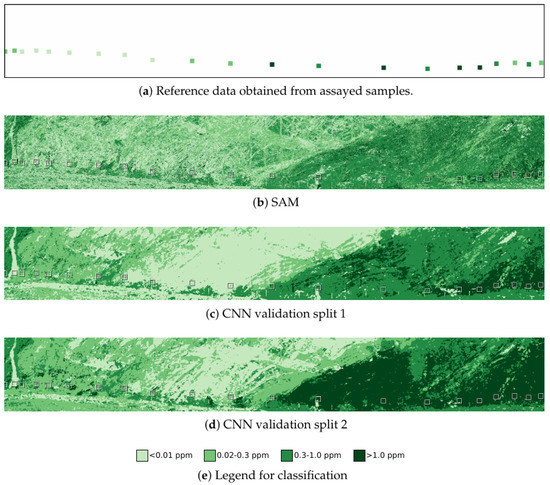 Classification into four ore grade bands was used to test the sensitivity to lower and higher grades of ore. One laboratory sample from each grade band was randomly selected as a validation sample, with two testing/validation splits of the laboratory dataset. In addition to the 0.3 ppm boundary of the mineralisation model, this model further discretised the waste category into above and below 0.01 ppm, the limit of detectable gold in the assay results, and the ore category into above and below 1.0 ppm, as high and low grade ore. These are arbitrary selections which could be varied in response to cut-offs for economically viable excavation, for example. Figure 6 shows the reference data of the assayed samples, now discretised to these four classes, along with the SAM and CNN classification results. Table 2 shows the per-class and overall accuracy relative to the reference data. Accuracy relative to the assayed samples is low, although the feature corresponding to the mineralisation envelope boundary is still visible. Furthermore, the high grade and low grade classifications are sensitive to the split of the laboratory samples into training and validation splits, as seen in Figure 6c,d and in the per-class accuracy. In the second training split, significantly more of the scanned scene is classified as high grade.