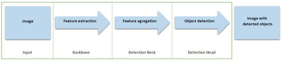 In the structure of the YOLO network, only convolutional layers are used, which makes it a fully convolutional neural network. The main parts of YOLO are presented in Figure 2. The input image features are compressed through a feature extractor (backbone). The detection neck is a feature aggregator that combines and mixes features formed in the backbone and then forwards them to the detection head [31].