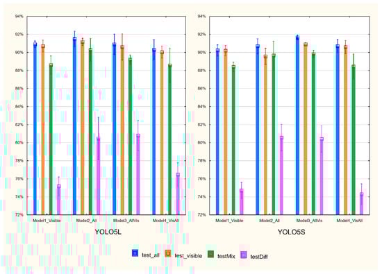 The training procedure was run three times and yielded twenty-four models. The average values and standard deviation of mAP@.5:.95 are presented in Figure 3. Very satisfactory average results of 88–92% were obtained, except for the test on test_diff with an average recognition of 74–81%. The evaluation of the 24 models on the testAll, testVisible, and testMix ranged from 86.8% to 92.4%. More than half of them reached the value of 90%. Detailed results for all models are shown in Table 1.