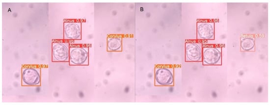 Sample image from the testMix dataset with predicted bounding boxes: (A) ModelAll (YOLOv5s) with Betula grains incorrectly detected as Corylus grain; (B) ModelVisAll (YOLOv5s) with a correctly detected Betula grain.