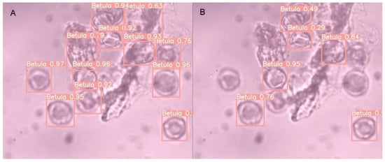Sample image from the testDiff dataset containing only Betula grains with predicted bounding boxes: (A) ModelAll (YOLOv5s); (B) ModelVisAll (YOLOv5s).