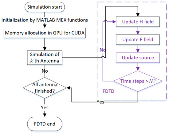 The GPU Tesla K20c has 13 streaming processors (SMs) and for each SM there are at most 2048 threads. Thus 13 × 2048 threads can be run simultaneously. The flowchart of the 3-D FDTD algorithm is shown in Figure 1. To reduce computational times, most of the FDTD functions are run on GPU (kernels), including the source update.