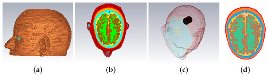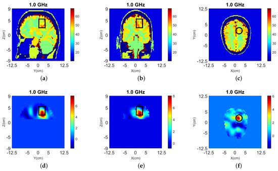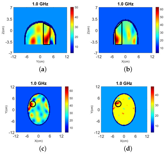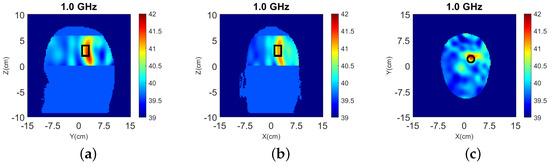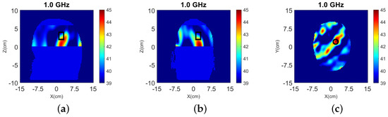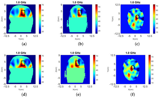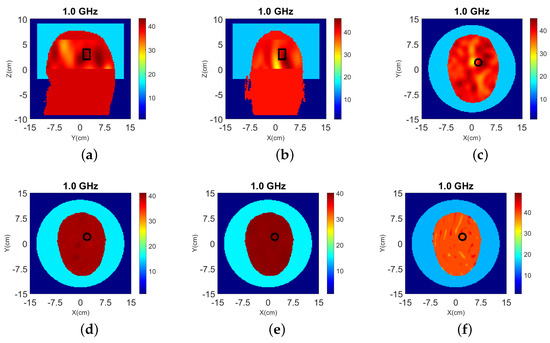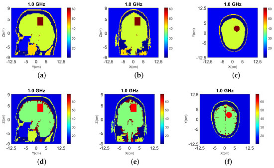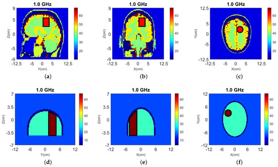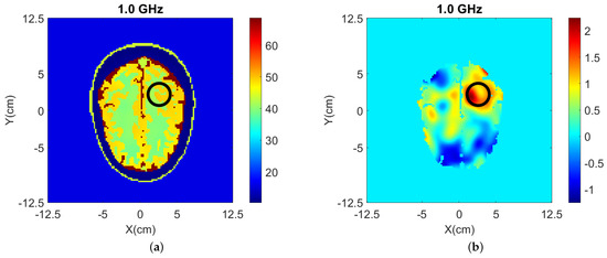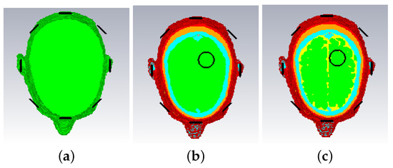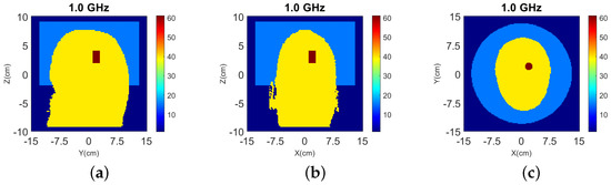 The head models are surrounded by 90–10% glycerol-water mixture, which we have used previously as immersion liquid in our recent experiment work [53,54]. The permittivity of the glycerol-water mixture is at 1.0 GHz. The Debye parameters , and . The relaxation time is fixed as ns for all the materials.