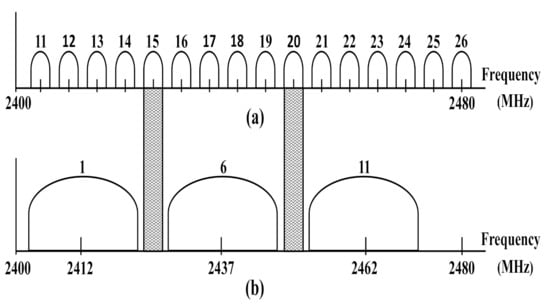 (a) IEEE 802.15.4 channels and (b) IEEE 802.11b/g non-overlapping channels in North America.
