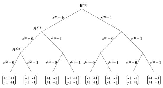 Considering the three-level partition chain that was constructed in Example 1, the encoding of the inter-multilevel super-orthogonal space–time code (IM-SOSTC-1) is presented in Figure 6.