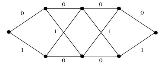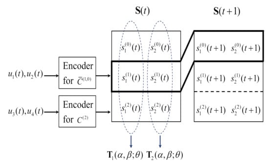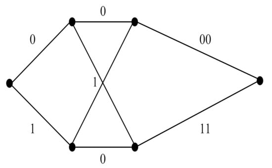 A two-state trellis diagram of a 2/3-rate convolutional code encoder is illustrated in Figure 5. Two message bits are encoded into three coded bits, which are then mapped onto one transmission matrix according to the partition chain . Since each transmission matrix contains two BPSK symbols within two time segments, the average spectral efficiency is 1 bit/s/Hz.