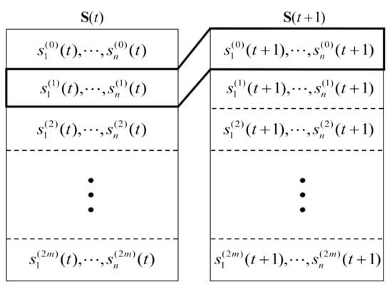 Now, the systematic design method for IM-SOSTC is described. Let where and are M-ary constellation symbols. If a 2m-level partitioning chain of with set partitioning can be constructed according to the CGD criterion introduced in [27]. By letting the super-orthogonal code denote the union of and a (2m+1)-level partitioning chain can be built. The coding configuration is presented in Figure 8. The coded block that is formed for the tth time segment is represented by where were determined in a previous time segment. During the first level of the encoding, is a codeword for the of length 2n, which combines and .