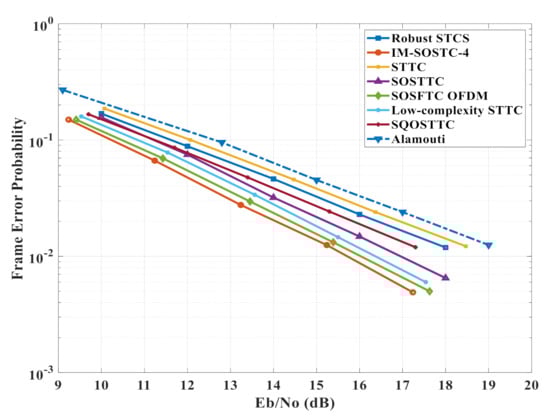 The simulation results for the frame error rate (FER) performance of the two-state IM-SOSTC-4 compared to other related low complexity orthogonal and super-orthogonal scheme designs are presented in Figure 10. In all simulations, two transmission antennas and one receiving antenna were considered on the quasi-static Rayleigh fading channel. Moreover, each segment consisted of 128 symbols out of each transmission antenna. It was also assumed that the path gains were constant over a frame of length n and varied from one frame to another. The simulation was performed using C language. From Figure 10, it can be noted that IM-SOSTC-4 surpassed the other related schemes in terms of coding gain. This coding gain achievement is reasonable because the minimum CGD of IM-SOSTC-4 is 64, which is considered high compared to the CGDs of other schemes. In general, the coding gain distance was high for low rate codes and hence, there was a trade-off between coding gain and the code rate. In addition, the super-orthogonal codes from [27,28,31] outperformed the orthogonal codes from [23,24,26,30], as can be observed from Figure 10.