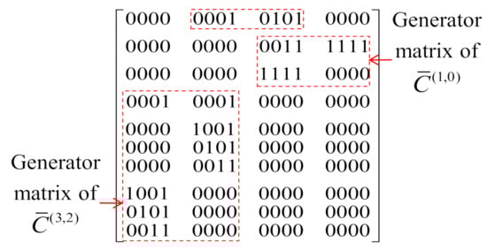Let represent the coded block that is formed for the tth time segment, where and were determined in the previous time segment and , and are determined in the current time segment. The encoding of the tth time segment includes two successive coded blocks, represented by and During the first level of encoding, is a codeword for a (4, 2) binary linear code . Thus, is a composition of and and the generator matrix of is where is the generator matrix of the (2, 1, 2) repetition code is the generator matrix of the (2, 2, 1) code and is the generator matrix of the (2, 1, 2) repetition code . During the second level of encoding, is a codeword for the (2, 2, 1) universal code For the column vector is mapped onto the transmission matrix Four message bits are encoded into two transmission matrices, which contain four BPSK symbols for the tth time segment. Therefore, the average spectral efficiency is 1 bit/s/Hz.