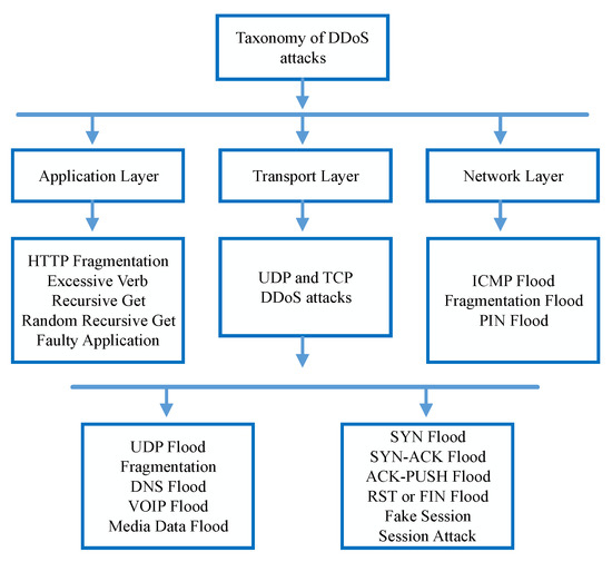 Flooding-based DDoS attacks cause consistent threat towards the smart industrial service providers of IoT. Frequently, such attacks follow the networking protocols and cause extensive network traffic and drain the network resources. Such intense penetrations of DDoS attacks result in the expensive exhaustion of servers and individual hosts’ communication capacity to respond to legitimate users. Usually, DDoS attackers explore UDP Flood, PING Flood, SYN Flood, and HTTP Flood to launch DDoS attacks [7,8,9]. According to the TCP/IP model, the taxonomy of well-known DDoS attacks is shown in Figure 1. Moreover, many spoofing tools and sophisticated online services are available to launch and hide the identity of the DDoS attackers, so network security systems become more fragile to such frequently launched attacks [10,11]. Until now, most of the major content providers such as Youtube, Facebook, Twitter, and Amazon have experienced service unavailability due to DDoS attacks. Similarly, IoT network operators also lack the sophisticated security tools to develop completely immune communication network from DDoS attacks [12,13].