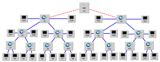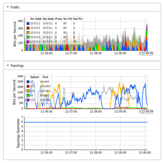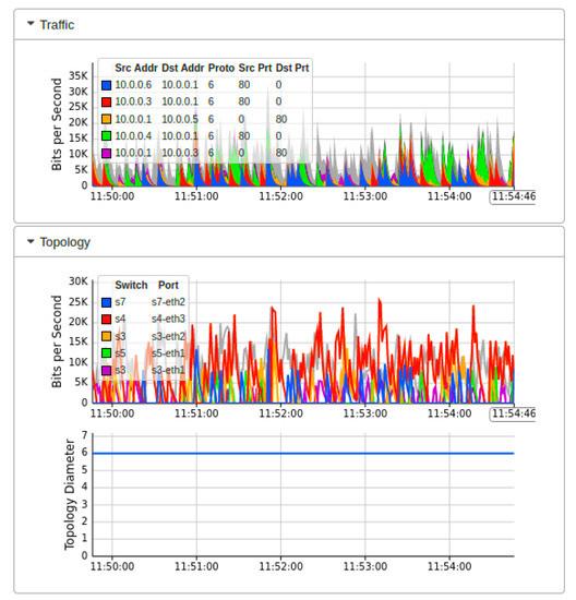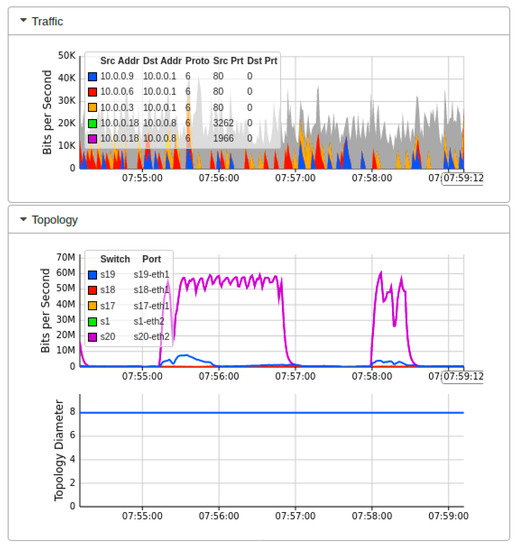Figure 16 showed the performance fluctuation once we launch the DDoS attack through the threat model. The threat model starts flooding ICMP messages to specific devices with a faster request rate. As a result, successful network traffic is poorly affected. The sub-graph of network topology shows the exponential growth of traffic requests over OF switches, which dramatically increase the traffic to 70 Mbps over a single OF switch. Meanwhile, the network diameter remains constant, but participating devices now face the flooding of ICMP messages at a drastic rate. As a result of this DDoS attack, the network throughput performance could reach zero, but due to the implementation of the AMLSDM framework, the network performance is stabilized with the passage of time.