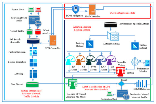 The operation of the above four phases results in the execution of designed four modules to achieve the DDoS detection and mitigation of the proposed AMLSDM framework. The detailed flowchart and work mechanism of the proposed AMLSDM framework is shown in Figure 5.