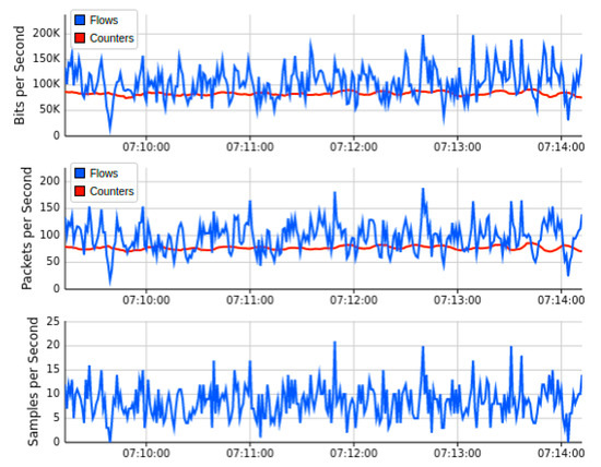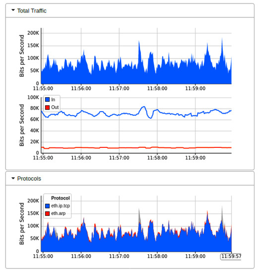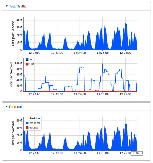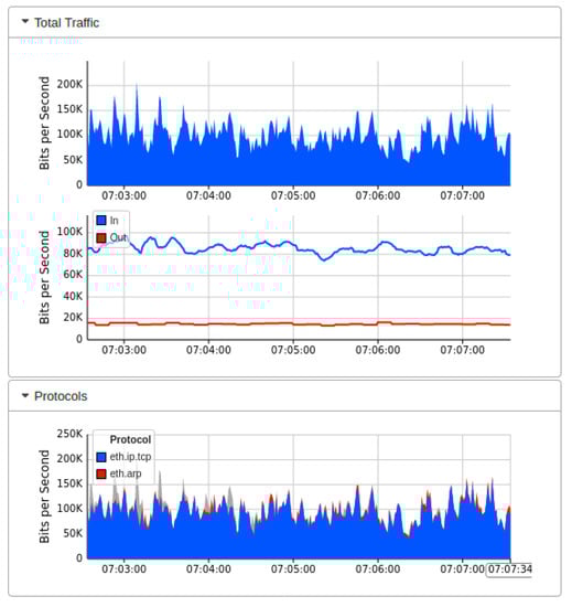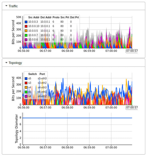 Figure 7 showed the real-time MININET emulation performance dashboard captured by sFlow for the proposed AMLSDM framework of the proposed network topology as shown in Figure 2. Those simulation settings are using POX SDN controller in a control plane. The SDN-enabled IoT network topology comprises of 14 OF Switches, that supports 28 end hosts. This network topology uses the external SDN controller of POX, which is running on VirtualBox. The ICMP ping messages are exchanged between the nodes to verify the reachability of the connected hosts in the network. The purpose of those ping messages is to check whether all the nodes are successfully linked with the network topology or not. Moreover, those ping messages also verify the regular network traffic by the nodes. The result of the successful link indicates that there is no malicious node present in the network, and a DDoS attack has not been initiated up to this point in the simulations. To start ICMP ping, we execute a traffic test over specific hosts, which checks the reachability of each network host individually. The sub-graph of traffic indicates the IP address of sources hosts and currently replying to destination hosts. In the absence of a DDoS attack, the normal traffic reaches a maximum of 30Kbps. The sub-graph of bits per second shows the particular OF switches and their associated ports involved in the current network traffic transmission. The subgraph of topology diameters indicates the traffic generation of particular host devices. Figure 8 indicates the network bandwidth dashboard in terms of bits per second utilized by the current generated network traffic. TCP and ARP protocols are being utilized for the basic ICMP network reachability test. Meanwhile, Figure 9 indicates the sFlow-test dashboard to identify the performance of switches’ activities regarding current simulation testing. The involved switches analyze the simulation by counting the flows, check sequence number, comparing byte flows to counters, comparing packet flows to counters, and checking the ingress and egress ports information and CPU load average to identify the nature of current traffic. We run the Collect.sh script to collect this information for machine learning algorithms based inspection to identify the DDoS attacks. Figure 9 provided the evidence that network traffic is normal, and our designed inspection validates the normality of the current network traffic.