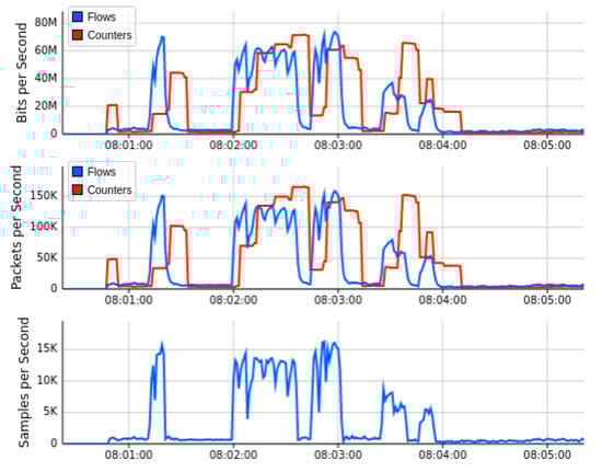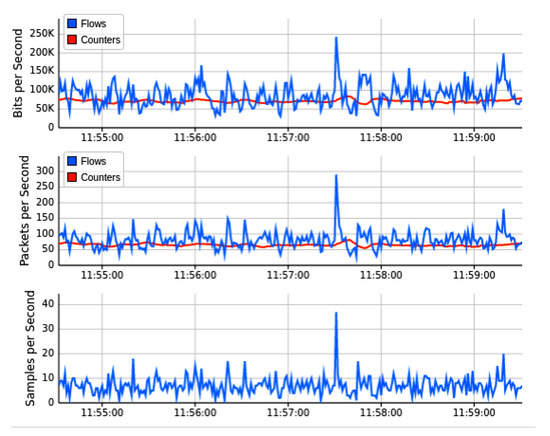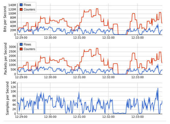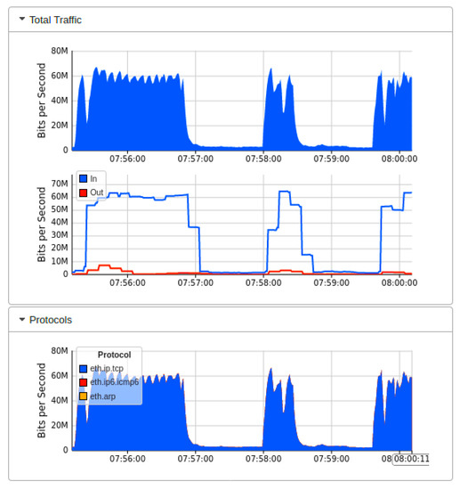 Similarly, Figure 17 and Figure 18 indicated the performance fluctuation at particular simulations segments when DDoS attacks are in action, and also indicate the performance restoration with the help of DDoS detection and mitigation of AMLSDM framework. Figure 17 showed network bandwidth utilization dashboard during real-time DDoS attacks. We can observe that network traffic increases exponentially once the DDoS attacks are being generated. Once we launch the AMLSDM framework, the network traffic decreases dramatically, and most of the DDoS are being detected and mitigated. In this way, we are able to give the resources back to legitimate users. Meanwhile, Figure 18 indicated the performance dashboard for OF switches during DDoS attacks. We experience the DDoS attacks over OF switches during simulation period, which causes the performance issue for OF switches. We execute the AMLSDM framework to bring down the network traffic to normal behavior.